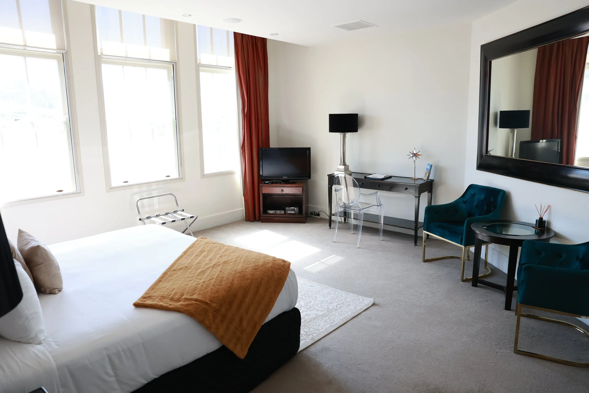 Nestled at the end of the third floor, this studio style room offers a super-king bed (or two large singles) plus a fold out single bed if required - sleeps max. 3 guests.