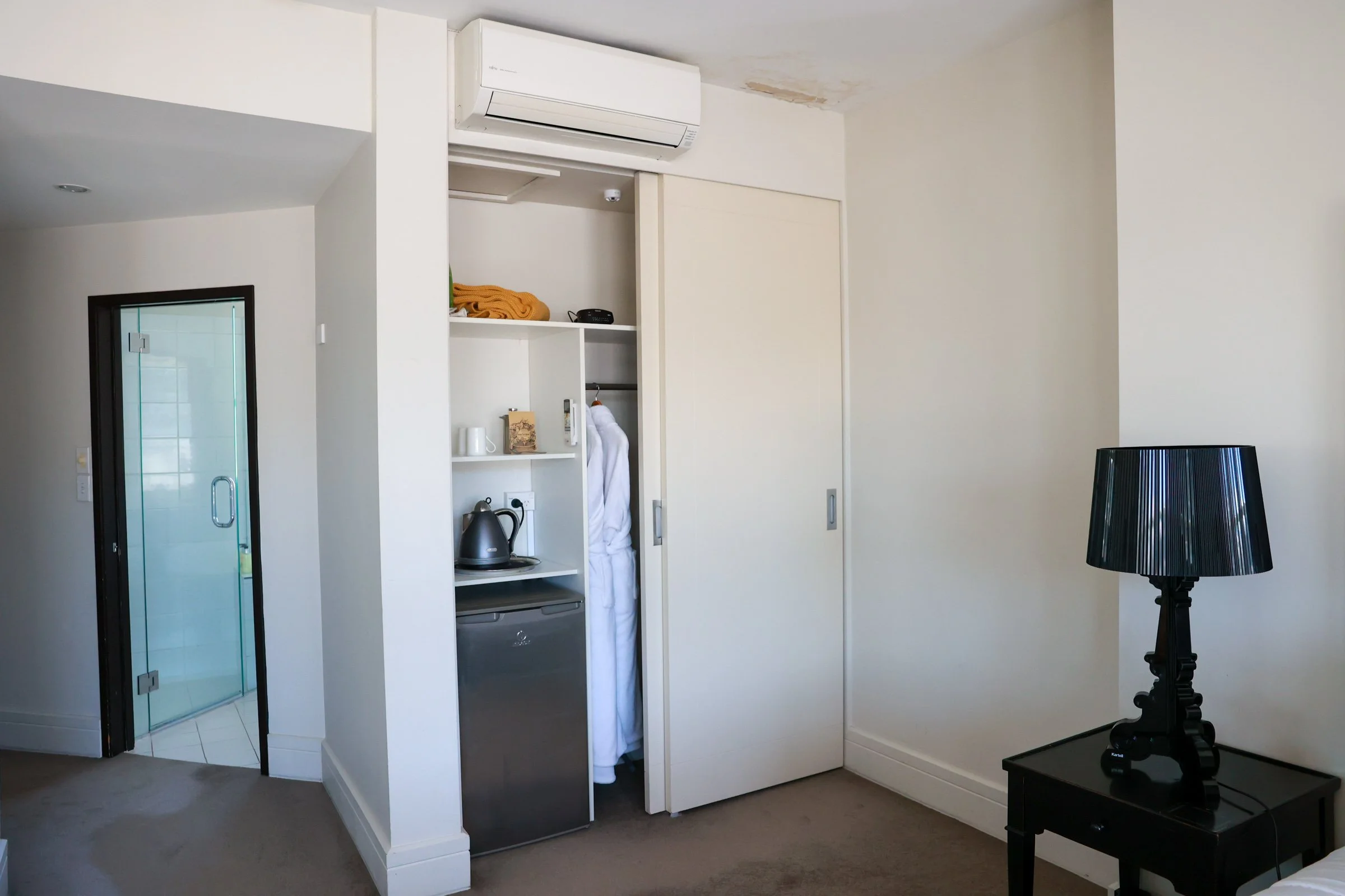 Tea and coffee in room plus shared kitchenette across the hall